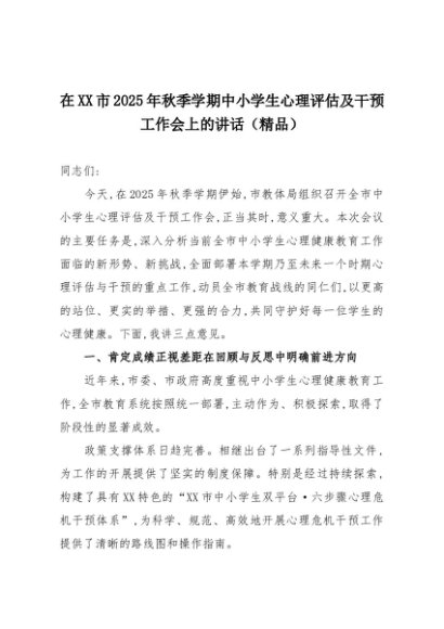 【七哥公文】2025年:在XX市2025年秋季学期中小学生心理评估及干预工作会上的讲话(精品)+更多免费公文+VX:QiGeGongWen2024
