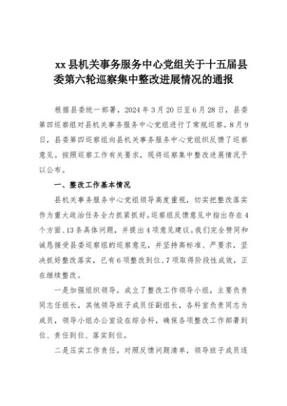 【七哥公文】2025年:xx县机关事务服务中心党组关于十五届县委第六轮巡察集中整改进展情况的通报+更多免费公文+VX:QiGeGongWen2024
