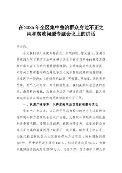 【七哥公文】2025年:在2025年全区集中整治群众身边不正之风和腐败问题专题会议上的讲话+更多免费公文+VX:QiGeGongWen2024