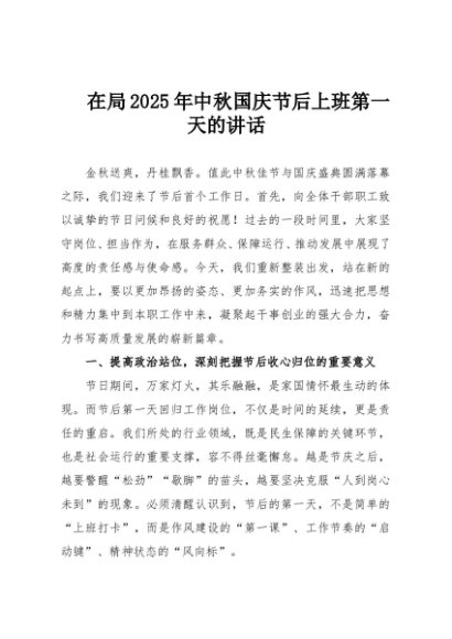 / 【七哥公文】2025年:在局2025年中秋国庆节后上班第一天的讲话+更多免费公文+VX:QiGeGongWen2024