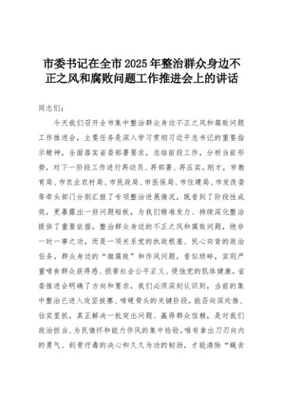 【七哥公文】2025年:市委书记在全市2025年整治群众身边不正之风和腐败问题工作推进会上的讲话+更多免费公文+VX:QiGeGongWen2024