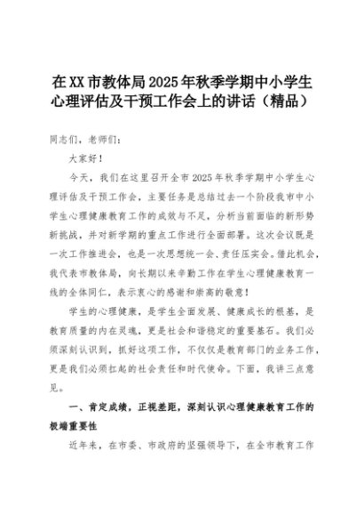 【七哥公文】2025年:在XX市教体局2025年秋季学期中小学生心理评估及干预工作会上的讲话(精品)+更多免费公文+VX:QiGeGongWen2024