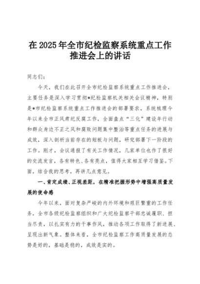 【七哥公文】2025年:在2025年全市纪检监察系统重点工作推进会上的讲话+更多免费公文+VX:QiGeGongWen2024