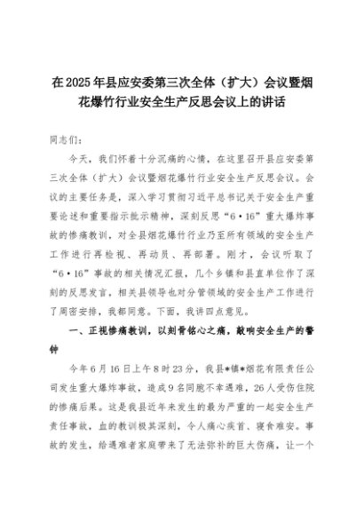【七哥公文】2025年:在2025年县应安委第三次全体(扩大)会议暨烟花爆竹行业安全生产反思会议上的讲话+更多免费公文+VX:QiGeGongWen2024