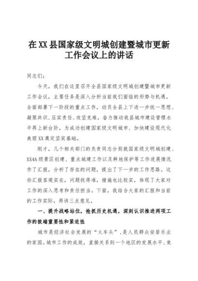 / 【七哥公文】2025年:在XX县国家级文明城创建暨城市更新工作会议上的讲话+更多免费公文+VX:QiGeGongWen2024