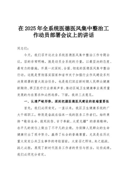【七哥公文】2025年:在2025年全系统医德医风集中整治工作动员部署会议上的讲话+更多免费公文+VX:QiGeGongWen2024
