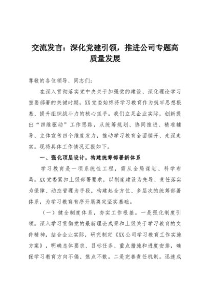 / 【七哥公文】2025年:交流发言:深化党建引领,推进公司专题高质量发展+更多免费公文+VX:QiGeGongWen2024
