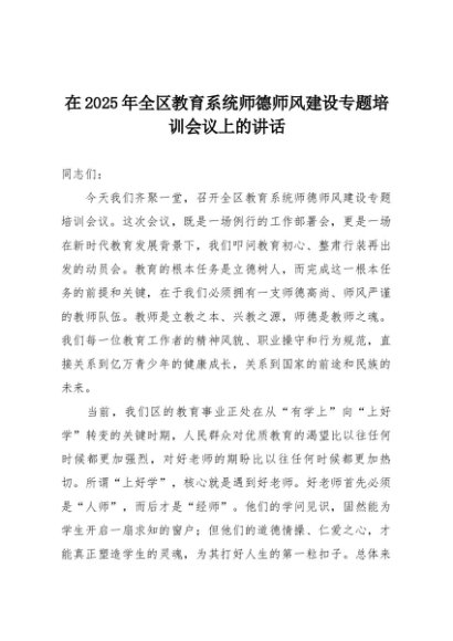 【七哥公文】2025年:在2025年全区教育系统师德师风建设专题培训会议上的讲话+更多免费公文+VX:QiGeGongWen2024