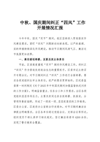 【七哥公文】2025年:中秋、国庆期间纠正“四风”工作开展情况汇报+更多免费公文+VX:QiGeGongWen2024