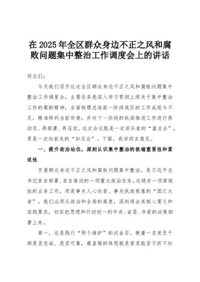 【七哥公文】2025年:在2025年全区群众身边不正之风和腐败问题集中整治工作调度会上的讲话+更多免费公文+VX:QiGeGongWen2024