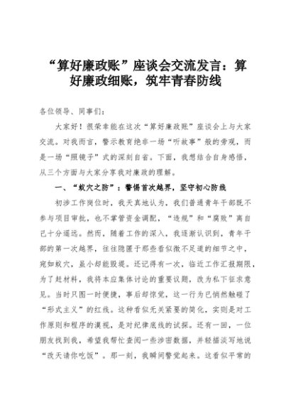 【七哥公文】2025年:“算好廉政账”座谈会交流发言:算好廉政细账,筑牢青春防线+更多免费公文+VX:QiGeGongWen2024
