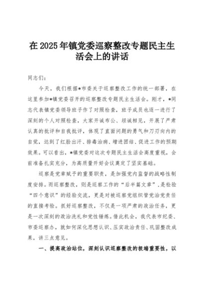 / 【七哥公文】2025年:在2025年镇党委巡察整改专题民主生活会上的讲话+更多免费公文+VX:QiGeGongWen2024