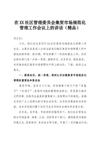 【七哥公文】2025年:在XX社区管理委员会集贸市场规范化管理工作会议上的讲话(精品)+更多免费公文+VX:QiGeGongWen2024