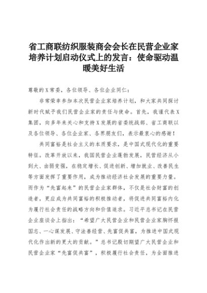 【七哥公文】2025年:省工商联纺织服装商会会长在民营企业家培养计划启动仪式上的发言:使命驱动温暖美好生活+更多免费公文+VX:QiGeGongWen2024
