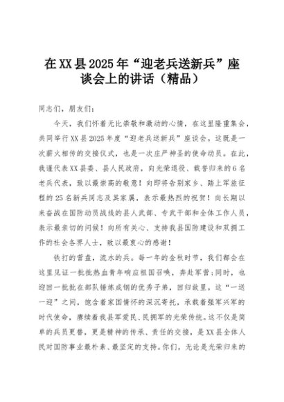 【七哥公文】2025年:在XX县2025年“迎老兵送新兵”座谈会上的讲话(精品)+更多免费公文+VX:QiGeGongWen2024
