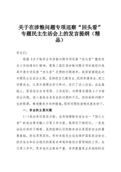 【七哥公文】2025年:关于在涉粮问题专项巡察“回头看”专题民主生活会上的发言提纲(精品)+更多免费公文+VX:QiGeGongWen2024