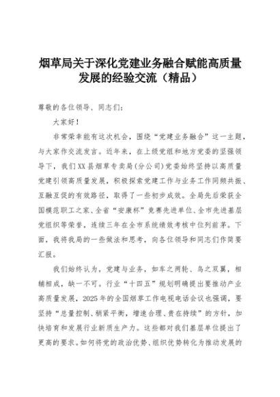 【七哥公文】2025年:烟草局关于深化党建业务融合赋能高质量发展的经验交流(精品)+更多免费公文+VX:QiGeGongWen2024