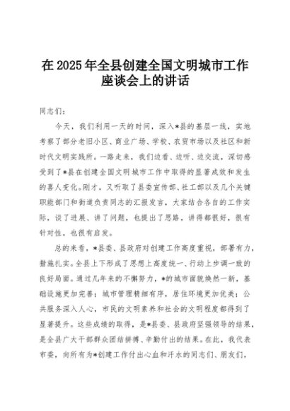 【七哥公文】2025年:在2025年全县创建全国文明城市工作座谈会上的讲话+更多免费公文+VX:QiGeGongWen2024