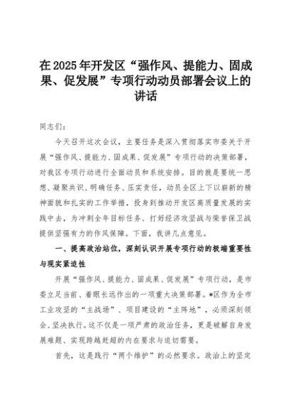 【七哥公文】2025年:在2025年开发区“强作风、提能力、固成果、促发展”专项行动动员部署会议上的讲话+更多免费公文+VX:QiGeGongWen2024