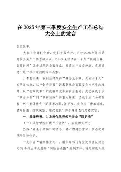 / 【七哥公文】2025年:在2025年第三季度安全生产工作总结大会上的发言+更多免费公文+VX:QiGeGongWen2024