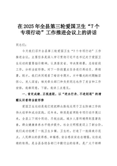 【七哥公文】2025年:在2025年全县第三轮爱国卫生“7个专项行动”工作推进会议上的讲话+更多免费公文+VX:QiGeGongWen2024