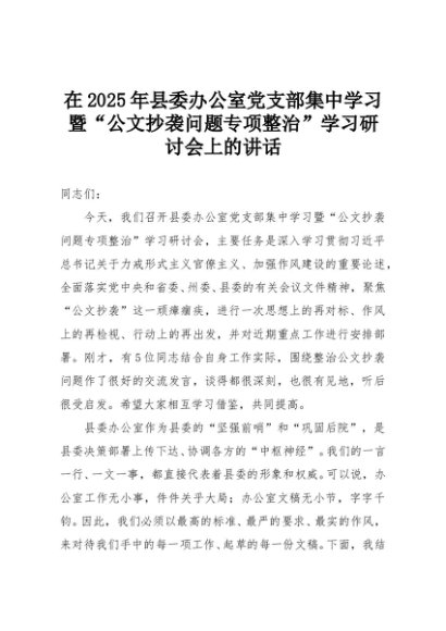 【七哥公文】2025年:在2025年县委办公室党支部集中学习暨“公文抄袭问题专项整治”学习研讨会上的讲话+更多免费公文+VX:QiGeGongWen2024