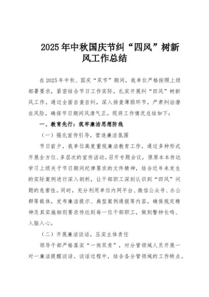 / 【七哥公文】2025年:2025年中秋国庆节纠“四风”树新风工作总结+更多免费公文+VX:QiGeGongWen2024
