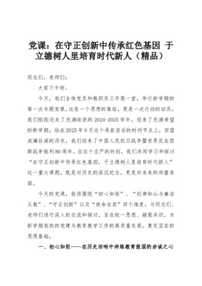 【七哥公文】2025年:党课:在守正创新中传承红色基因 于立德树人里培育时代新人(精品)+更多免费公文+VX:QiGeGongWen2024