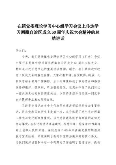 【七哥公文】2025年:在镇党委理论学习中心组学习会议上传达学习西藏自治区成立60周年庆祝大会精神的总结讲话+更多免费公文+VX:QiGeGongWen2024