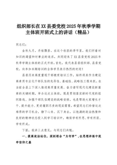 【七哥公文】2025年:组织部长在XX县委党校2025年秋季学期主体班开班式上的讲话(精品)+更多免费公文+VX:QiGeGongWen2024