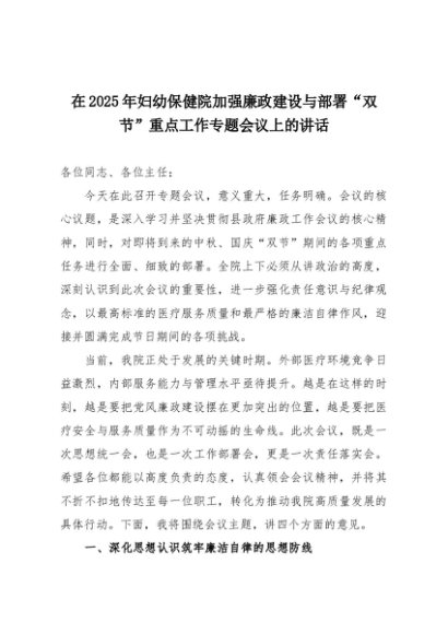 【七哥公文】2025年:在2025年妇幼保健院加强廉政建设与部署“双节”重点工作专题会议上的讲话+更多免费公文+VX:QiGeGongWen2024
