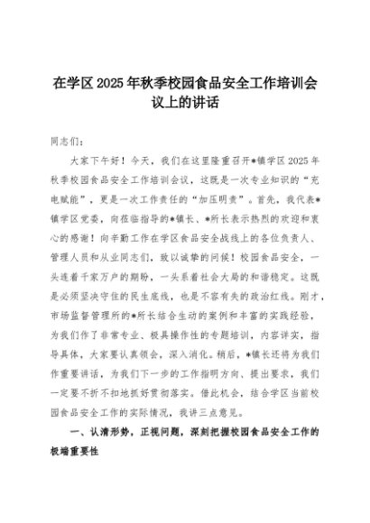 【七哥公文】2025年:在学区2025年秋季校园食品安全工作培训会议上的讲话+更多免费公文+VX:QiGeGongWen2024