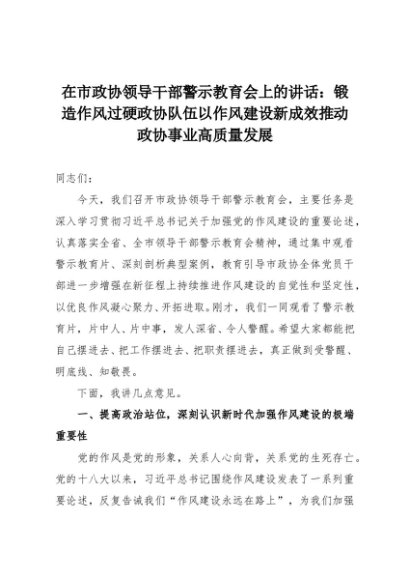 【七哥公文】2025年:在市政协领导干部警示教育会上的讲话:锻造作风过硬政协队伍以作风建设新成效推动政协事业高质量发展+更多免费公文+VX:QiGeGongWen2024