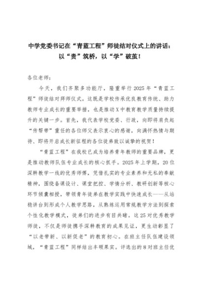 【七哥公文】2025年:中学党委书记在“青蓝工程”师徒结对仪式上的讲话:以“责”筑桥,以“学”破茧!+更多免费公文+VX:QiGeGongWen2024