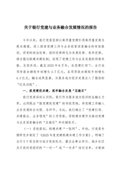 / 【七哥公文】2025年:关于银行党建与业务融合发展情况的报告+更多免费公文+VX:QiGeGongWen2024