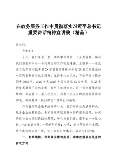 【七哥公文】2025年:在政务服务工作中贯彻落实习近平总书记重要讲话精神宣讲稿(精品)+更多免费公文+VX:QiGeGongWen2024