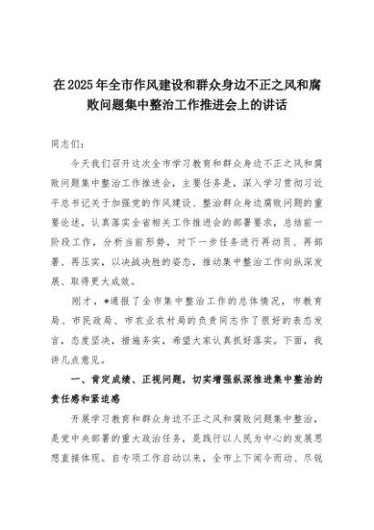 【七哥公文】2025年:在2025年全市作风建设和群众身边不正之风和腐败问题集中整治工作推进会上的讲话+更多免费公文+VX:QiGeGongWen2024