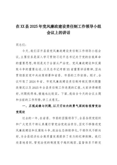 【七哥公文】2025年:在XX县2025年党风廉政建设责任制工作领导小组会议上的讲话+更多免费公文+VX:QiGeGongWen2024