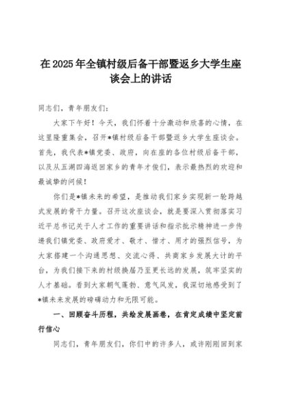 【七哥公文】2025年:在2025年全镇村级后备干部暨返乡大学生座谈会上的讲话+更多免费公文+VX:QiGeGongWen2024