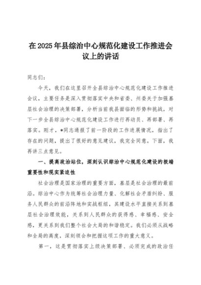 【七哥公文】2025年:在2025年县综治中心规范化建设工作推进会议上的讲话+更多免费公文+VX:QiGeGongWen2024