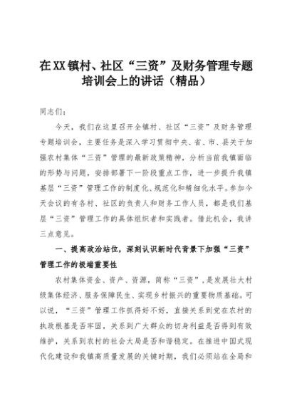 【七哥公文】2025年:在XX镇村、社区“三资”及财务管理专题培训会上的讲话(精品)+更多免费公文+VX:QiGeGongWen2024