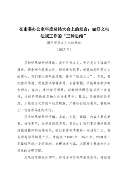 【七哥公文】2025年:在市委办公室年度总结大会上的发言:做好文电法规工作的“三种思维”+更多免费公文+VX:QiGeGongWen2024
