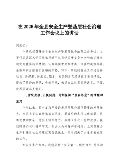 【七哥公文】2025年:在2025年全县安全生产暨基层社会治理工作会议上的讲话+更多免费公文+VX:QiGeGongWen2024