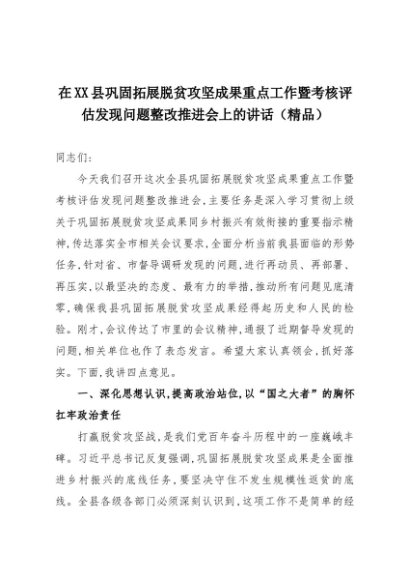 【七哥公文】2025年:在XX县巩固拓展脱贫攻坚成果重点工作暨考核评估发现问题整改推进会上的讲话(精品)+更多免费公文+VX:QiGeGongWen2024