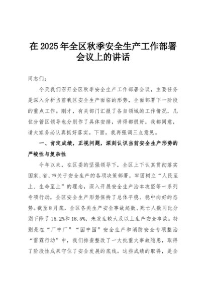 / 【七哥公文】2025年:在2025年全区秋季安全生产工作部署会议上的讲话+更多免费公文+VX:QiGeGongWen2024