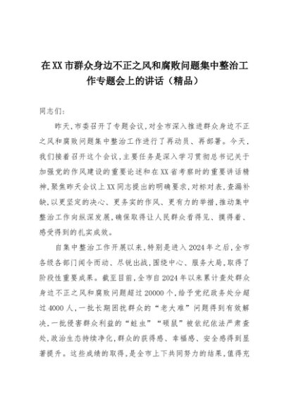 【七哥公文】2025年:在XX市群众身边不正之风和腐败问题集中整治工作专题会上的讲话(精品)+更多免费公文+VX:QiGeGongWen2024