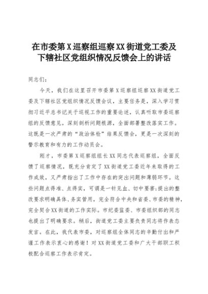 【七哥公文】2025年:在市委第X巡察组巡察XX街道党工委及下辖社区党组织情况反馈会上的讲话+更多免费公文+VX:QiGeGongWen2024