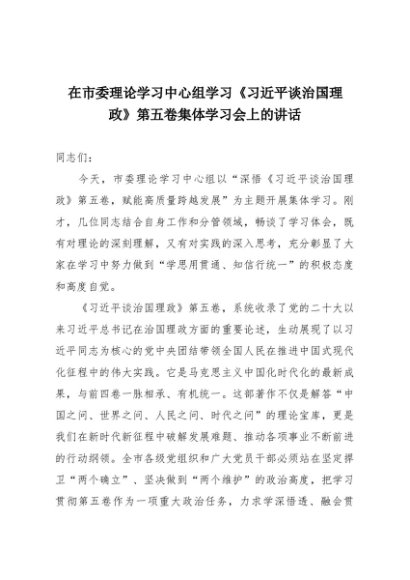 【七哥公文】2025年:在市委理论学习中心组学习《习近平谈治国理政》第五卷集体学习会上的讲话+更多免费公文+VX:QiGeGongWen2024