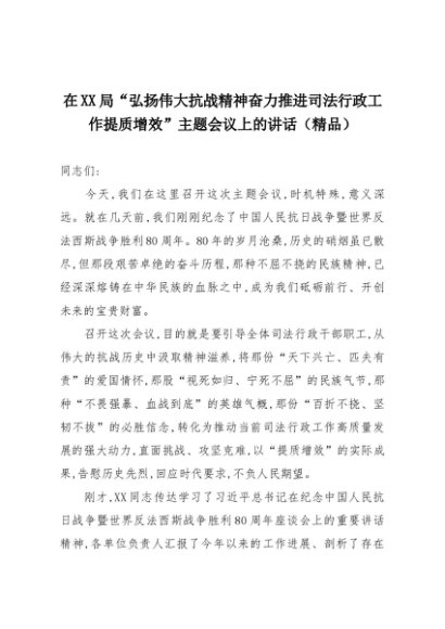 【七哥公文】2025年:在XX局“弘扬伟大抗战精神奋力推进司法行政工作提质增效”主题会议上的讲话(精品)+更多免费公文+VX:QiGeGongWen2024