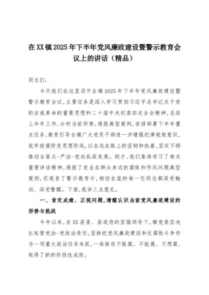 【七哥公文】2025年:在XX镇2025年下半年党风廉政建设暨警示教育会议上的讲话(精品)+更多免费公文+VX:QiGeGongWen2024